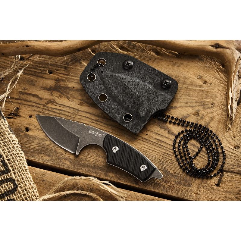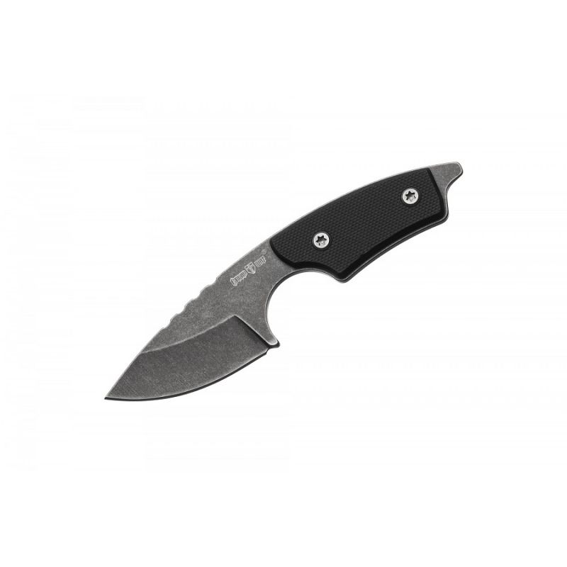 Данная модель относится к фиксированным шейный ножам с клинком формы drop point из стали 3Cr13 и покрытием Black Stonewash. Нож сочетает в себе универсальность и современный внешний вид. Дополнительная насечка на обухе позволяет надежно упереться большим пальцем во время работы. На тыльной части рукоятки предусмотрен функциональный ударный элемент.