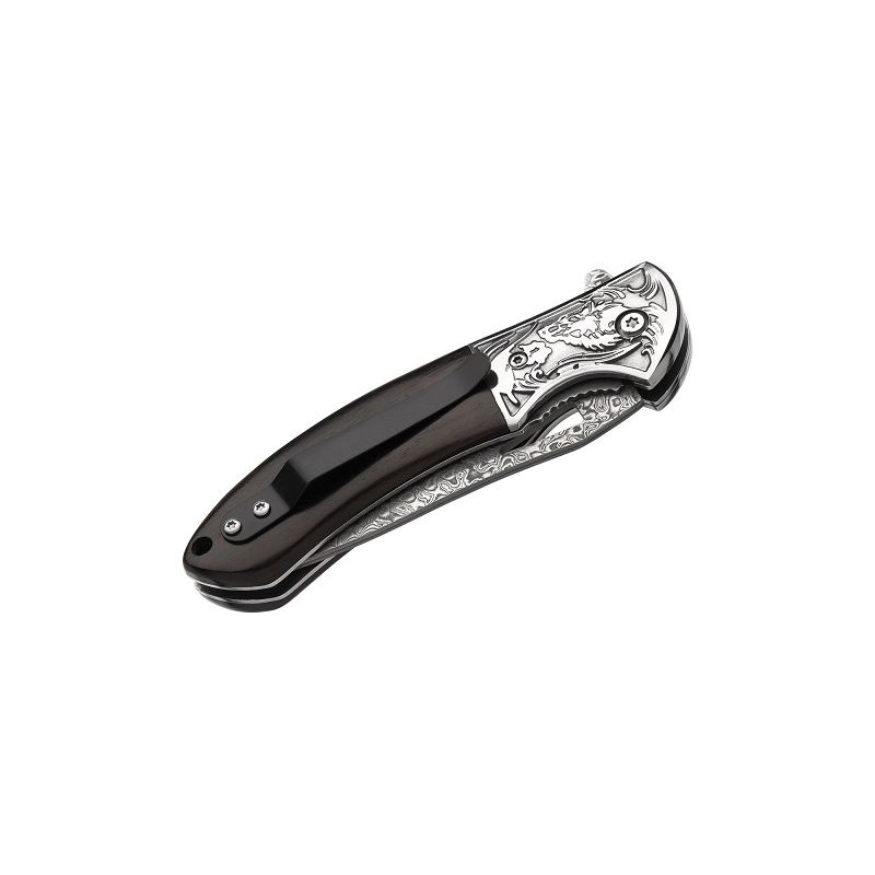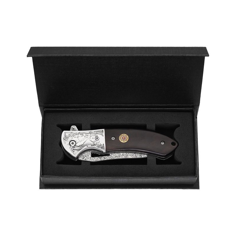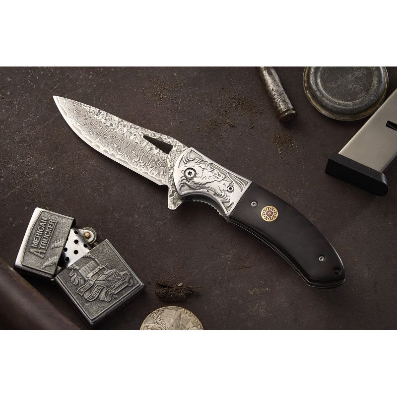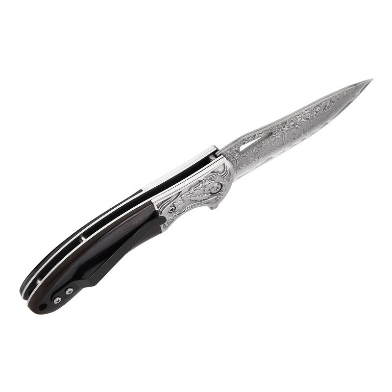 Grand Way представляет элегантный складной нож, предназначенный для тех, кто ценит качество, стиль и внимание к деталям. Его клинок выполнен из настоящей дамасской стали – прочного многослойного материала, известного своей долговечной остротой и характерным волнистым рисунком.