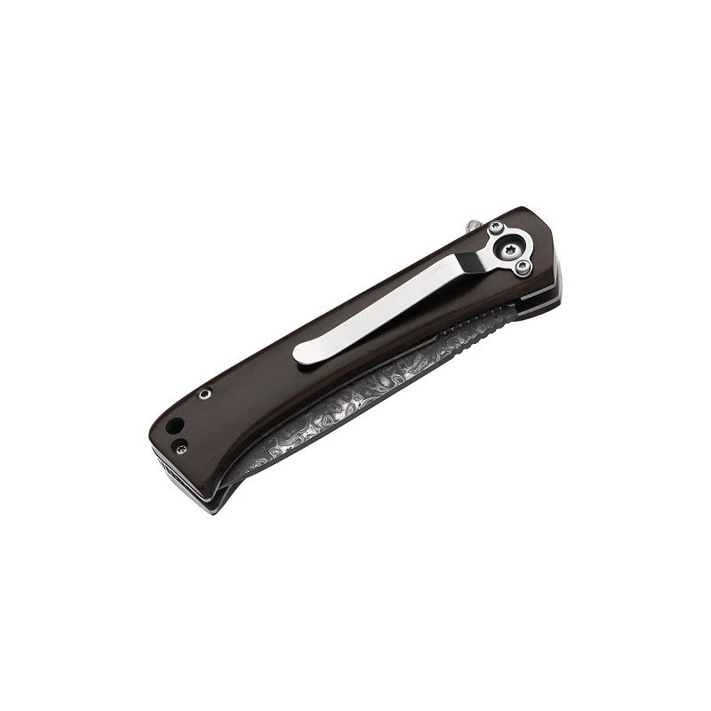 Рукоятка выполнена из сандалового дерева – прочного, долговечного и красиво текстурированного материала. Полированные деревянные накладки на стальных лайнерах создают чувство серьезности и благородства. На рукоятке предусмотрено отверстие под темляк. Прочная клипса позволяет с удобством носить нож в кармане.