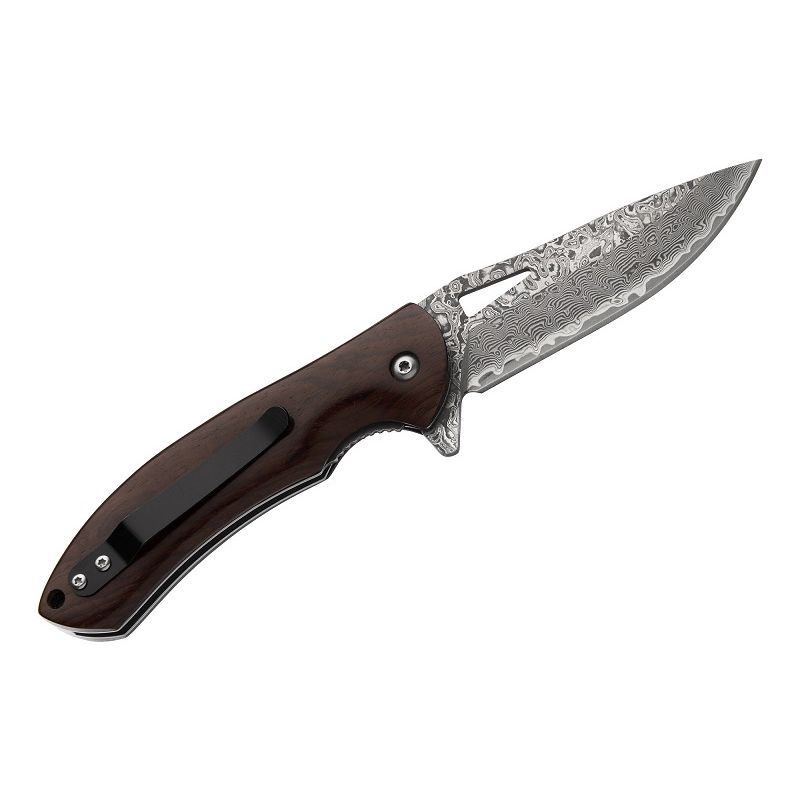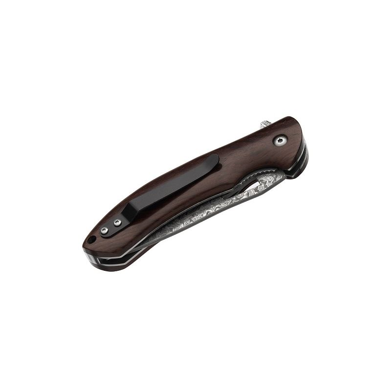 Рукоятка выполнена из сандалового дерева, которое приятно ложится в руку и отлично визуально сочетается с полированной сталью. Деревянные накладки установлены на крепких стальных лайнерах, что делает конструкцию долговечной и устойчивой к нагрузкам. Для удобства повседневной носки и работы ножом предусмотрены клипса и отверстие под темляк.