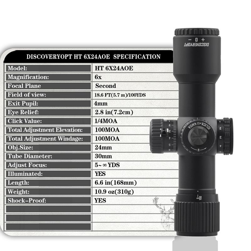 В целом обозначение Discovery HT 6х24 AOE указывает на компактный оптический прицел с фиксированной кратностью, усиленной конструкцией, регулируемым объективом и ориентацией на использование с мощной пневматикой и практическими стрелковыми задачами.