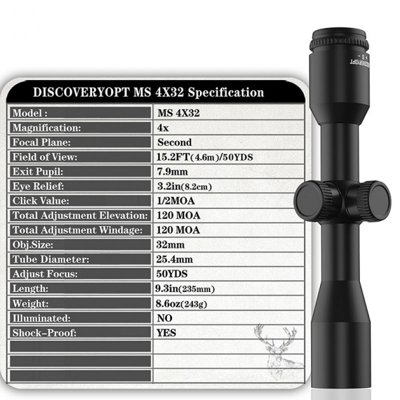 В целом, обозначение Discovery MS 4х32 указывает на компактный и надёжный оптический прицел с фиксированной кратностью, усиленной ударостойкой конструкцией и ориентацией на практическое использование, включая установку на мощную пневматику.