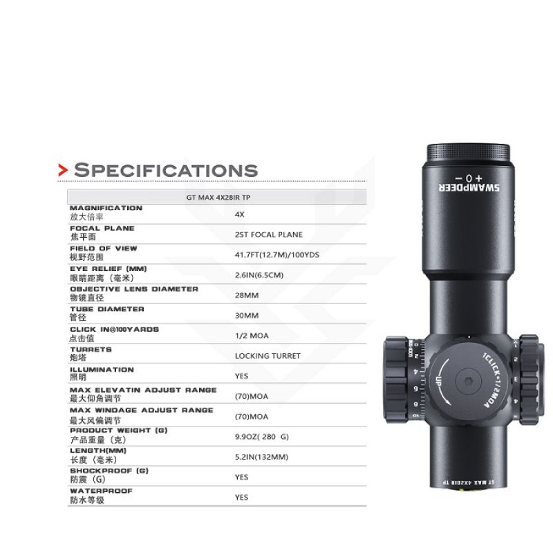 Прицел оптический Swamp deer GT MAX 4X28 IR — это практичный и надёжный оптический прицел, ориентированный на тренировочную, прикладную и охотничью стрельбу на ближних и средних дистанциях, где ценятся простота, устойчивость и понятная логика работы оптики.
