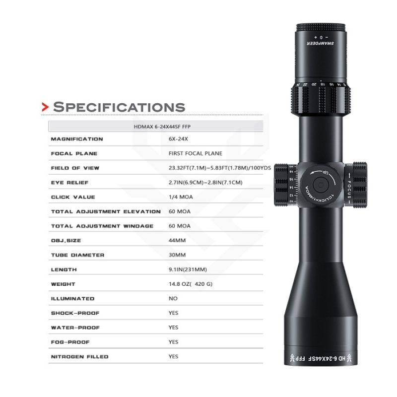 Прицел оптический Swamp deer HD MAX 6-24X44 SF FFP MINI — компактный оптический прицел с большим диапазоном изменяемой кратности, предназначенный для точной стрельбы на средних и дальних дистанциях.