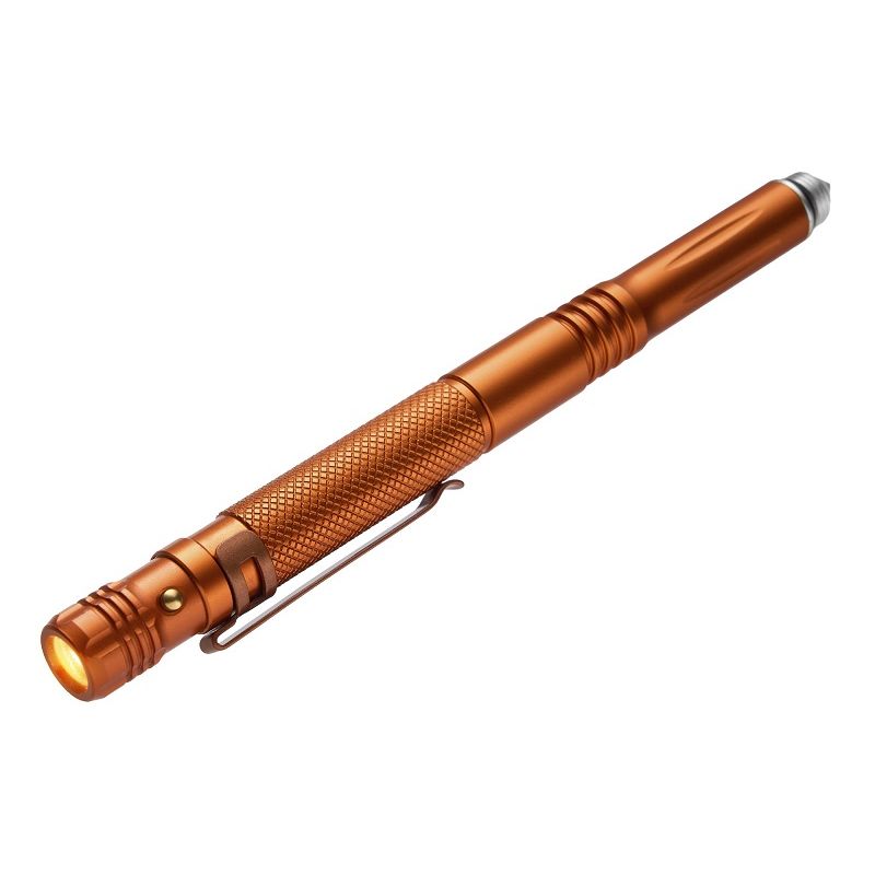 На тыльной стороне ручки находится низкопрофильная клипса для удобного ношения на кармане или ремне, а также встроенный светодиодный фонарик, который можно вывинтить и использовать отдельно.