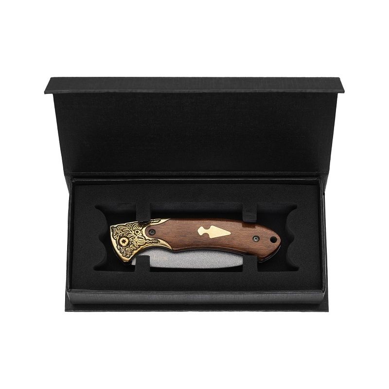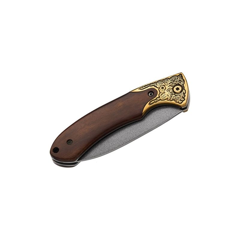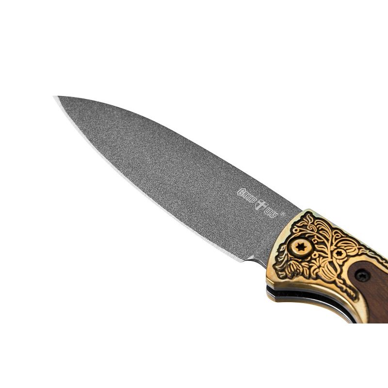 Рукоятка виготовлена із сталі та горіхового дерева. Воно успішно доповнено декоративними латунними елементами. Теплий контраст матеріалів створює почуття благородства та стилю.