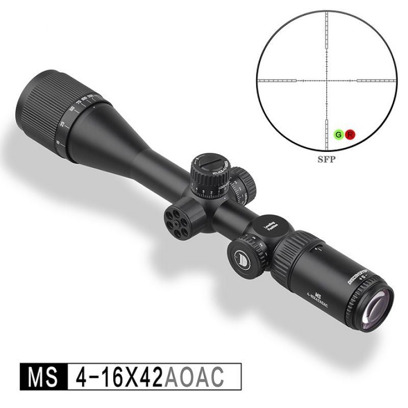 Discovery MS 4-16х42 AOAC - оптичний приціл зі змінною кратністю від 4х до 16х, призначений для точної стрільби на малих, середніх та далеких дистанціях. Широкий діапазон кратності збільшення робить приціл помітно універсальнішим, ніж моделі з постійною кратністю. Мале збільшення робить приціл зручним для швидкого пошуку мети, а максимальна кратність (16×) забезпечує достатню деталізацію точного вицілювання на дистанції.