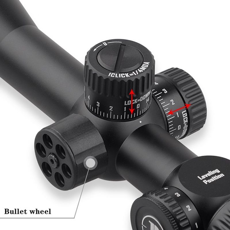 Прицільна сітка розташована у другій фокальній площині (SFP), завдяки чому її візуальний розмір залишається незмінним при зміні кратності.